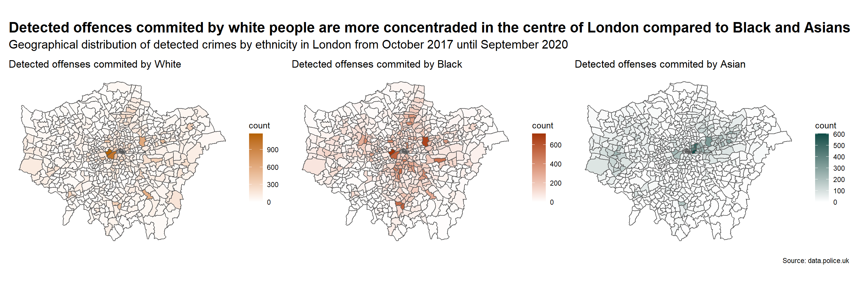 title = 'Detected offences commited by white people are more concentraded in the centre of London compared to Black and Asians',