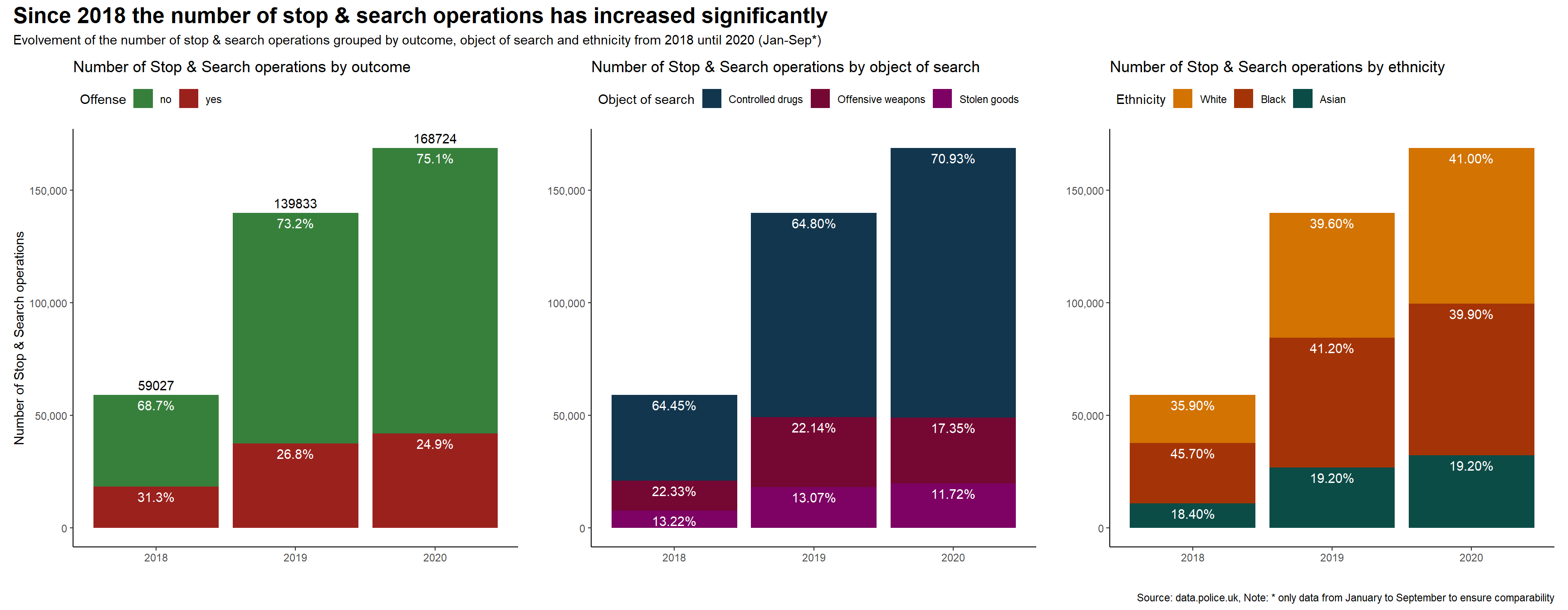 subtitle = 'Evolvement of the number of stop & search operations grouped by outcome, object of search and ethnicity from 2018 until 2020 (Jan-Sep*)',