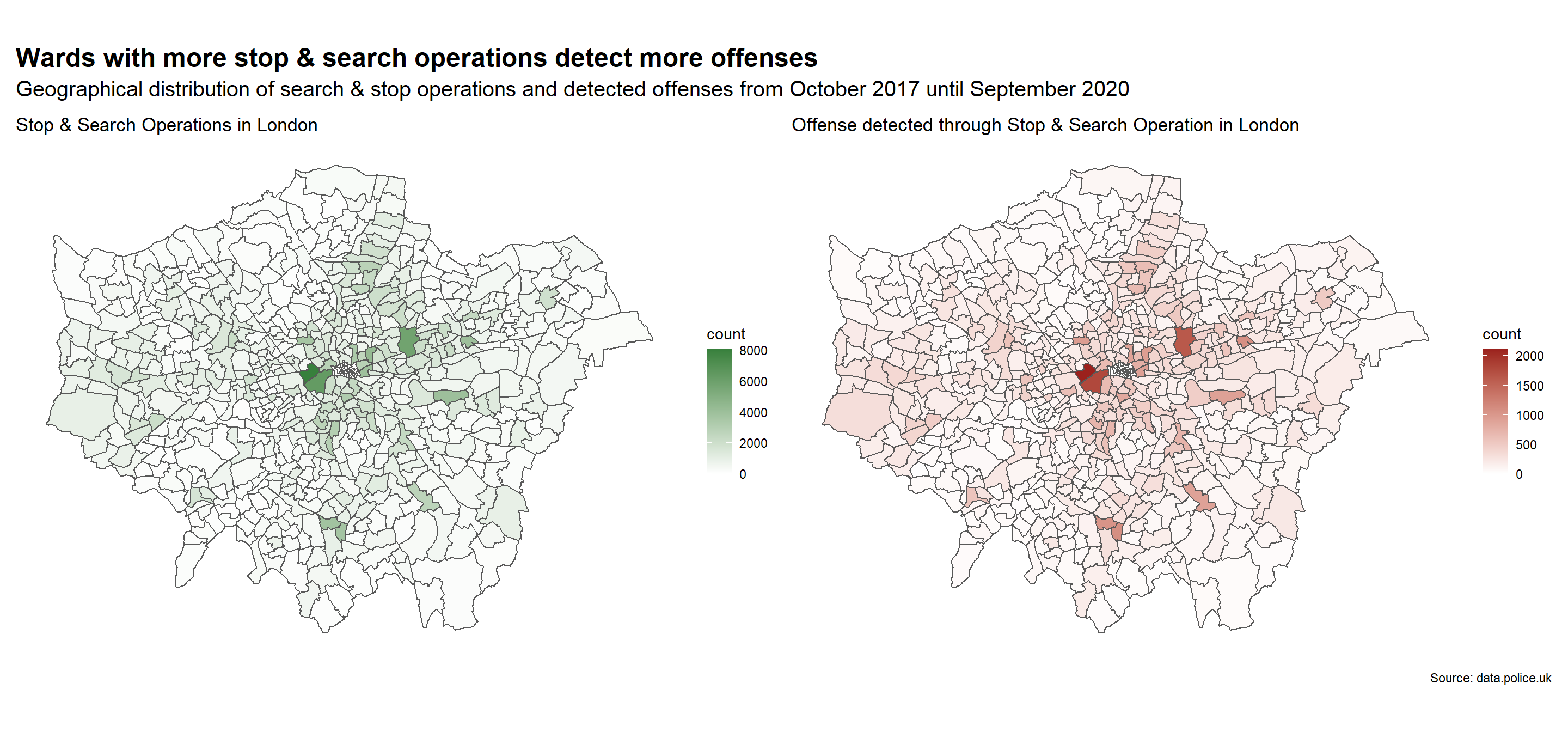 As starting point, I analysed changes in the number of Stop & Search operations and detected offenses over time from October 2017 until September 2020. While the plots showed a significant increase in the number of both over time, the percentage of detected offenses compared to the number of stop & search operations decreased from 31.3% to 24.9%. Furthermore, the distribution of objects of search and of ethnicity of the searched individuals did not change over time. Having detected this, I decided to not look at changes over time when it comes to these variables but rather at other variables. To analyse the geographical distribution of stop & search operations as well as of the detected offenses, I map the respective numbers for each ward. The distribution of searches and crimes is not homogeneous, but they preliminary happen in the centre of London. But, no significant difference between the distribution of stop & search operations and detected offenses can be seen. Therefore, in my further analysis I will focus solely on the geographical distribution of number of detected offenses. Finally, I plot the data on the map of London grouped by ethnicity and by object searched to detect patterns in the geographical distribution. From the created maps it is evident, that the detection of crimes related to offensive weapons is more geographically dispersed than related to drugs or stolen goods. Moreover, detected offences committed by white people are more concentrated in the centre of London compared to Black and Asians