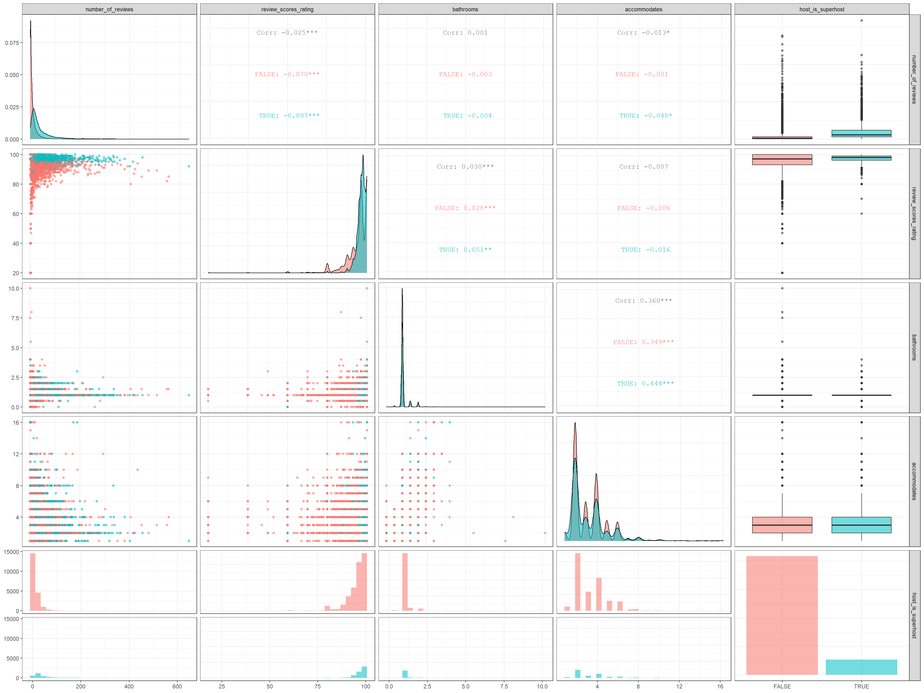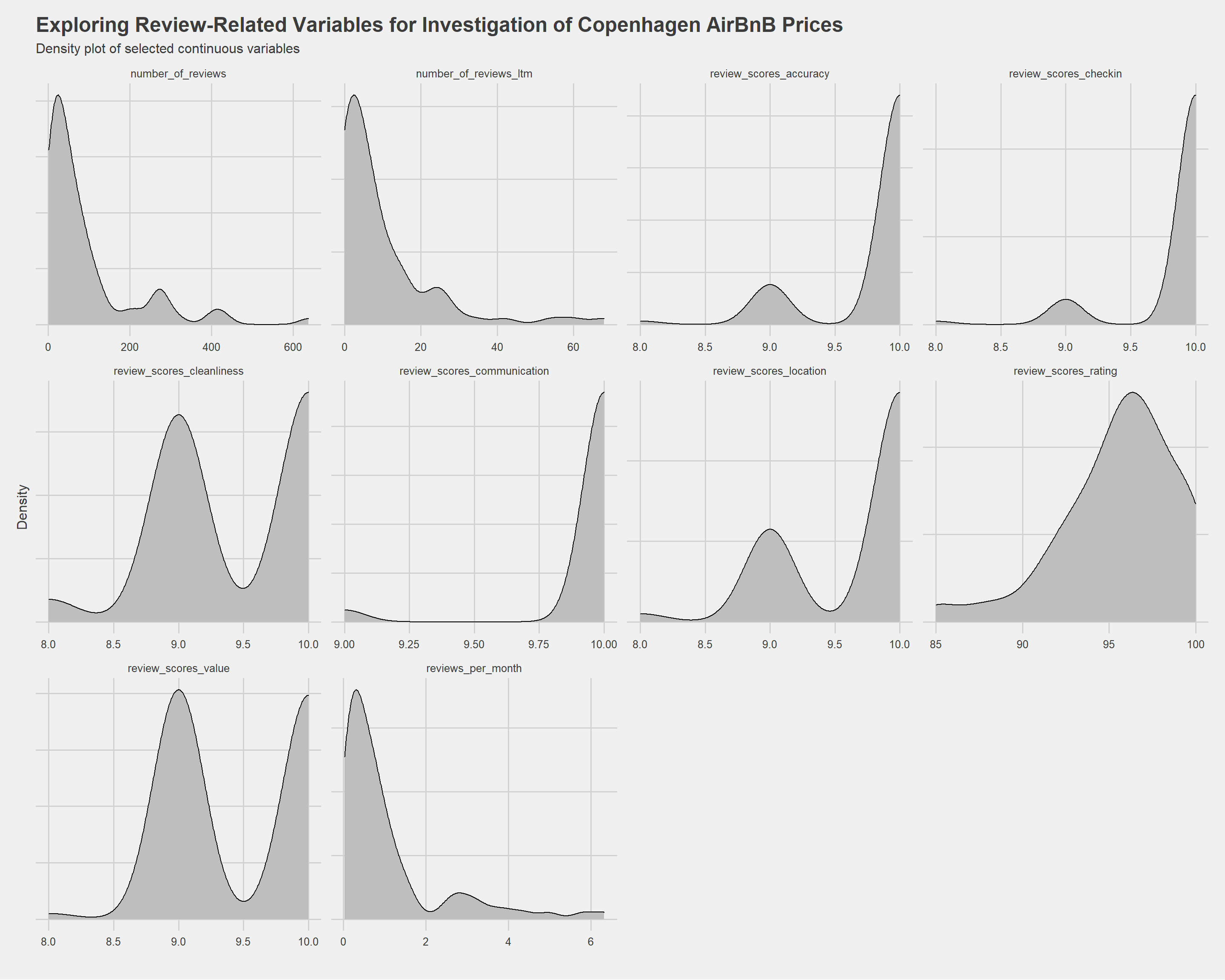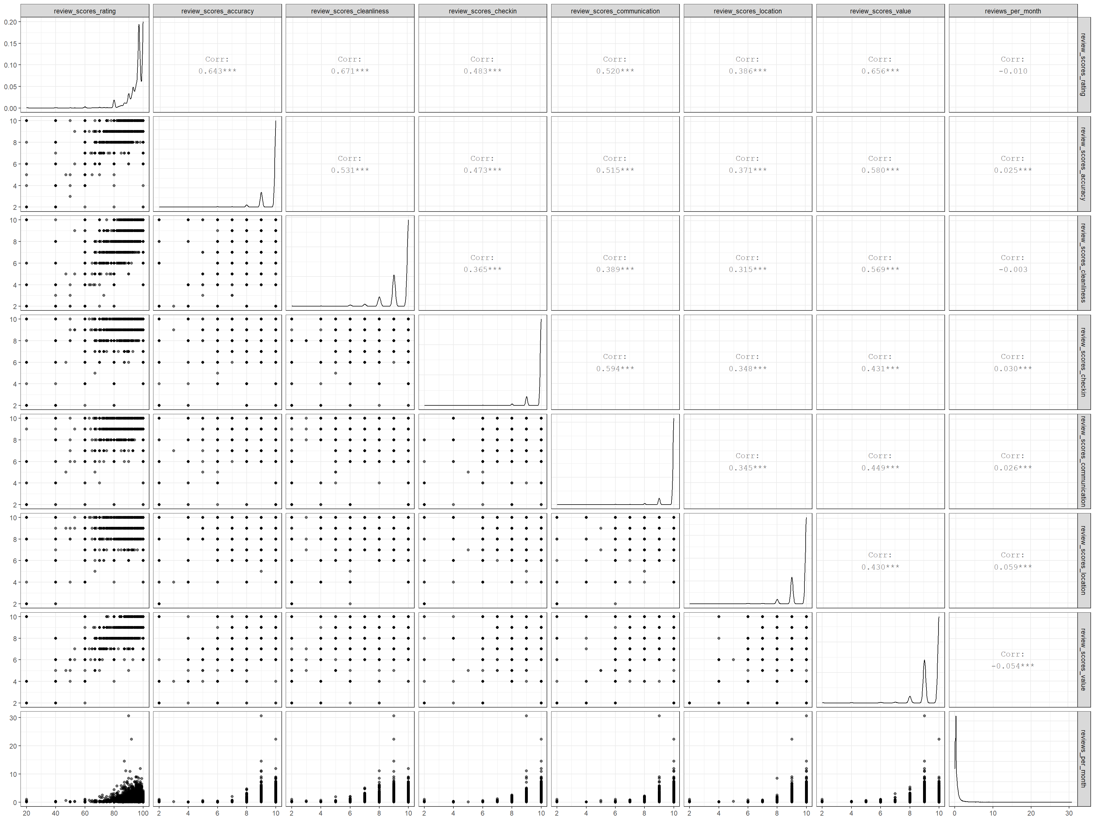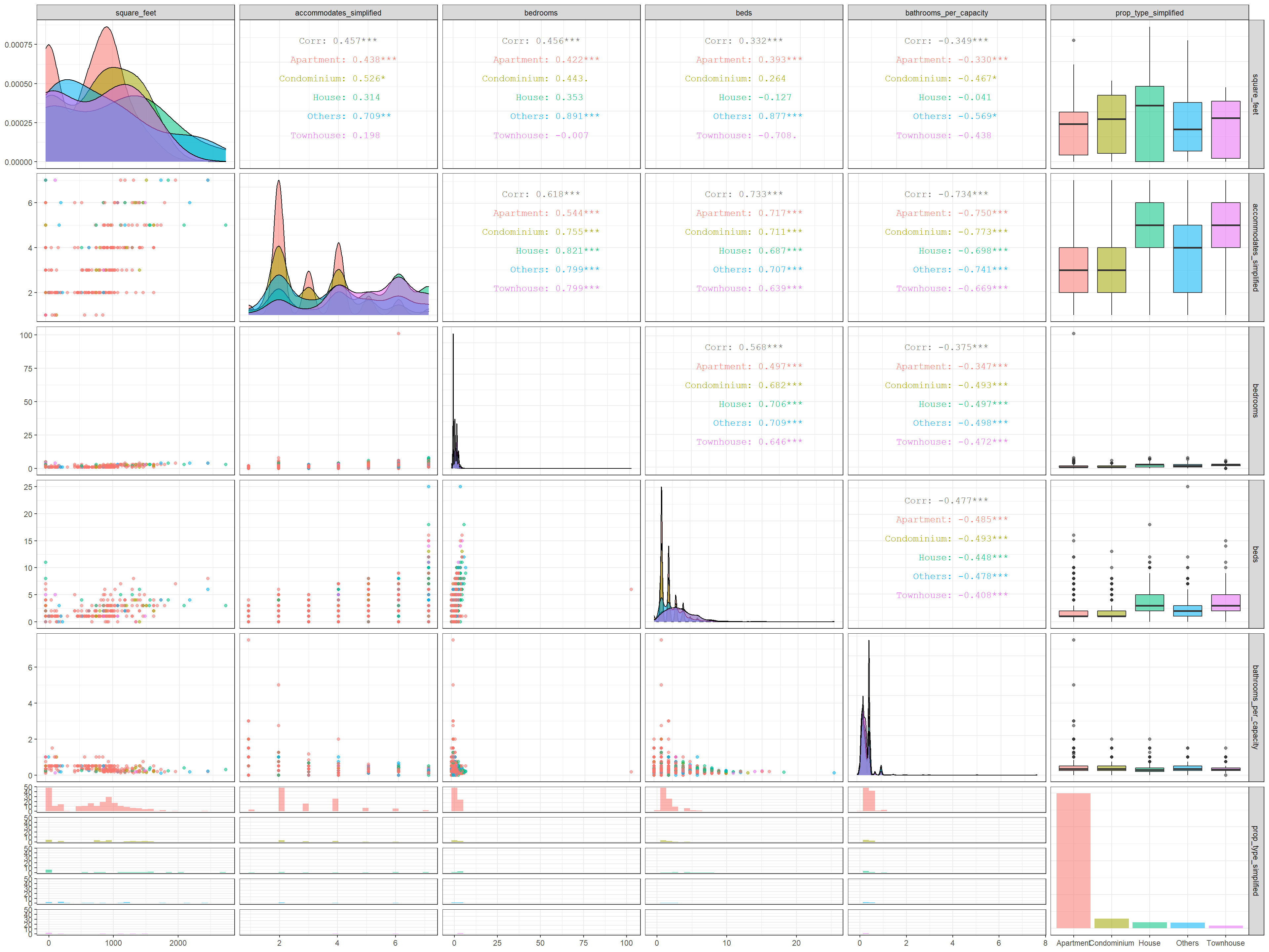 After having selected meaningful variables, summary statistics were created and then visualized in tables, density plots, bar plots and correlation matrices. In doing so, I found some correlations between review-related variables and listing type-related variables.