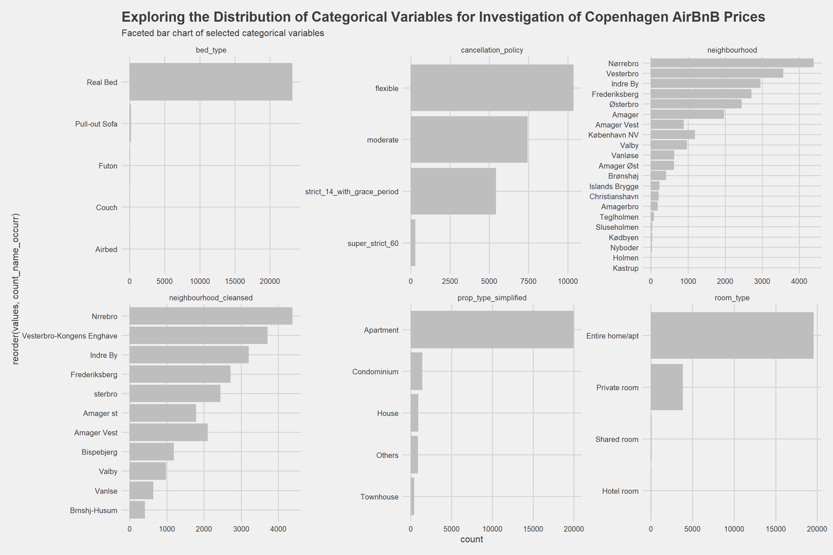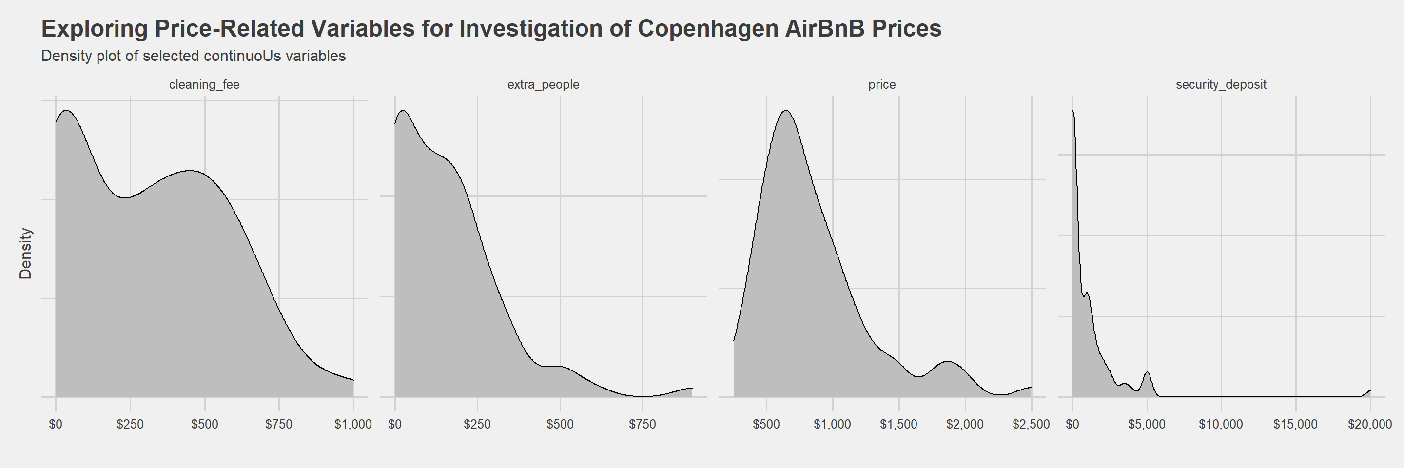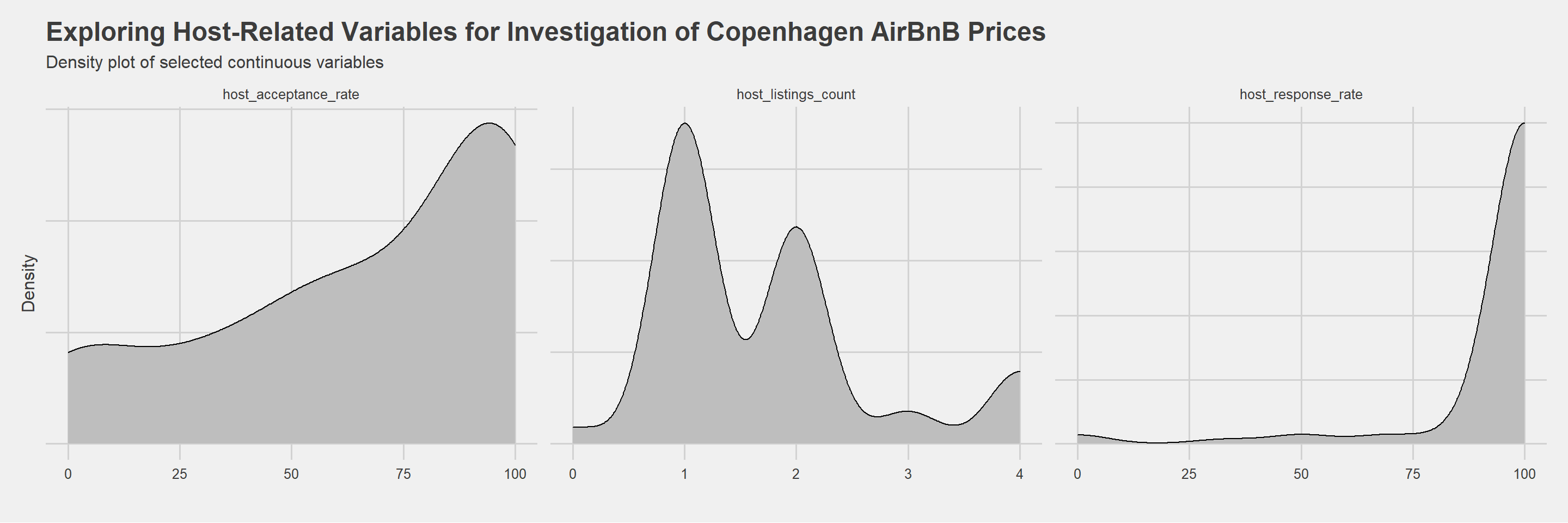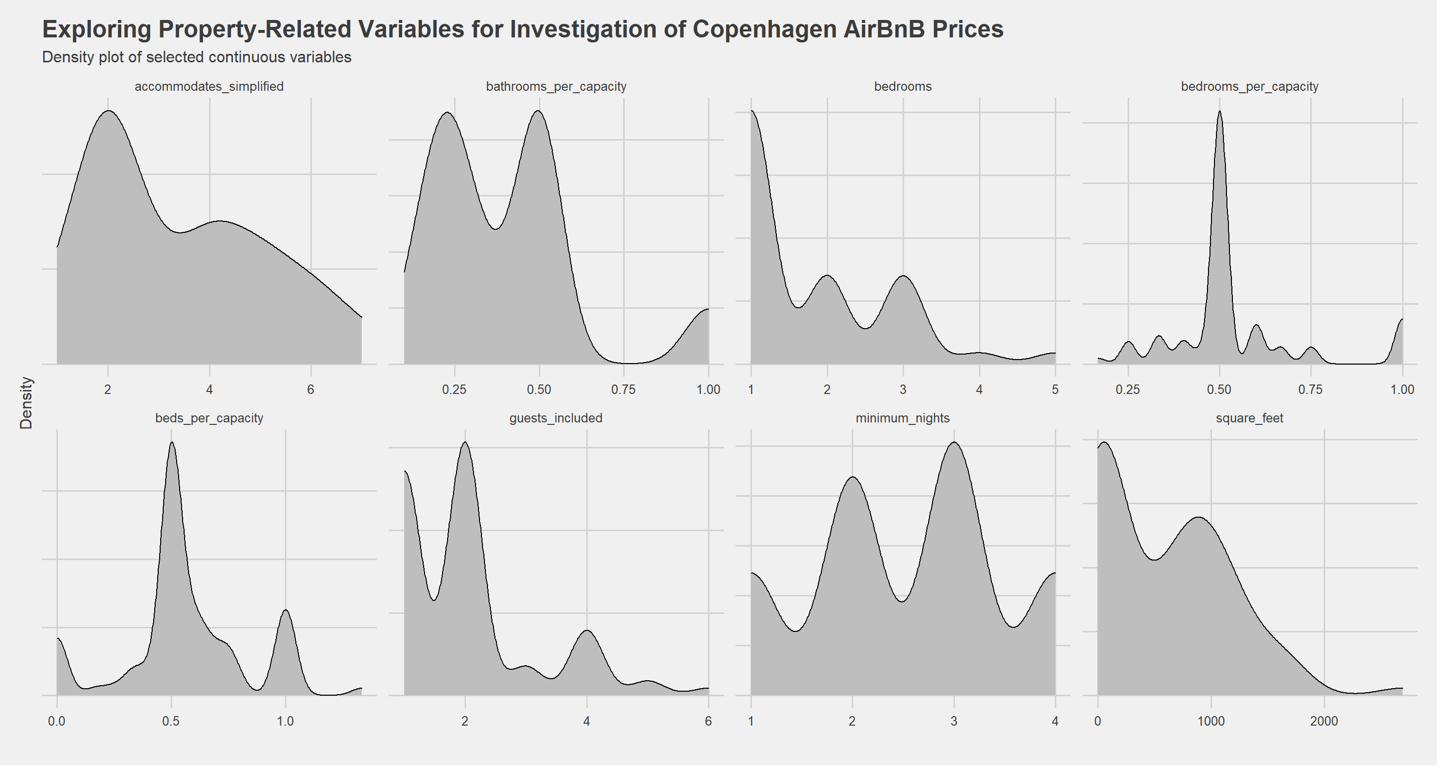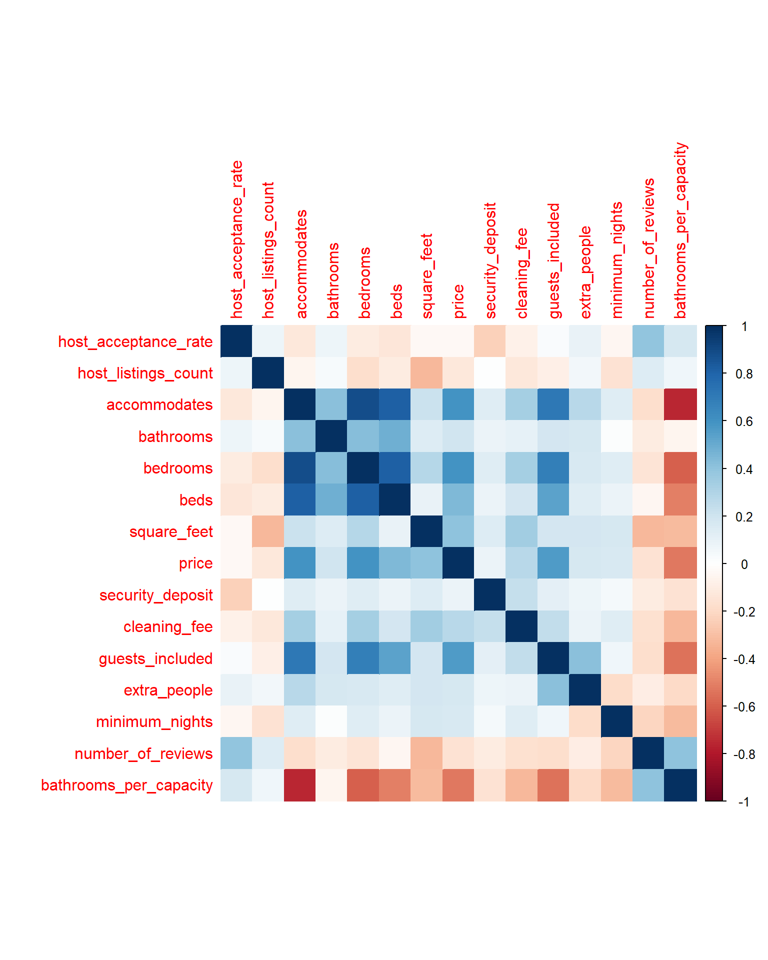 After having selected meaningful variables, summary statistics were created and then visualized in tables, density plots, bar plots and correlation matrices. In doing so, I found some correlations between review-related variables and listing type-related variables.