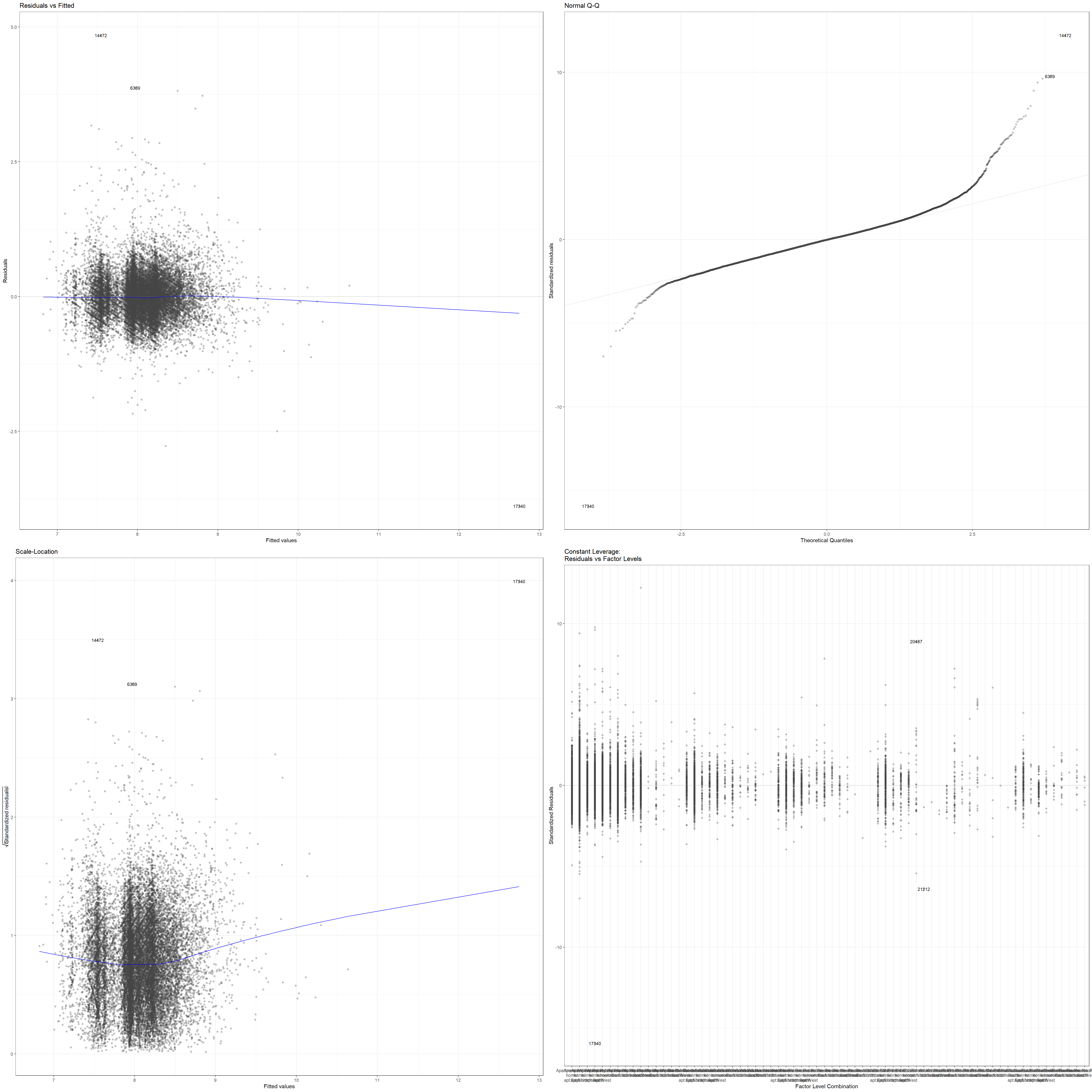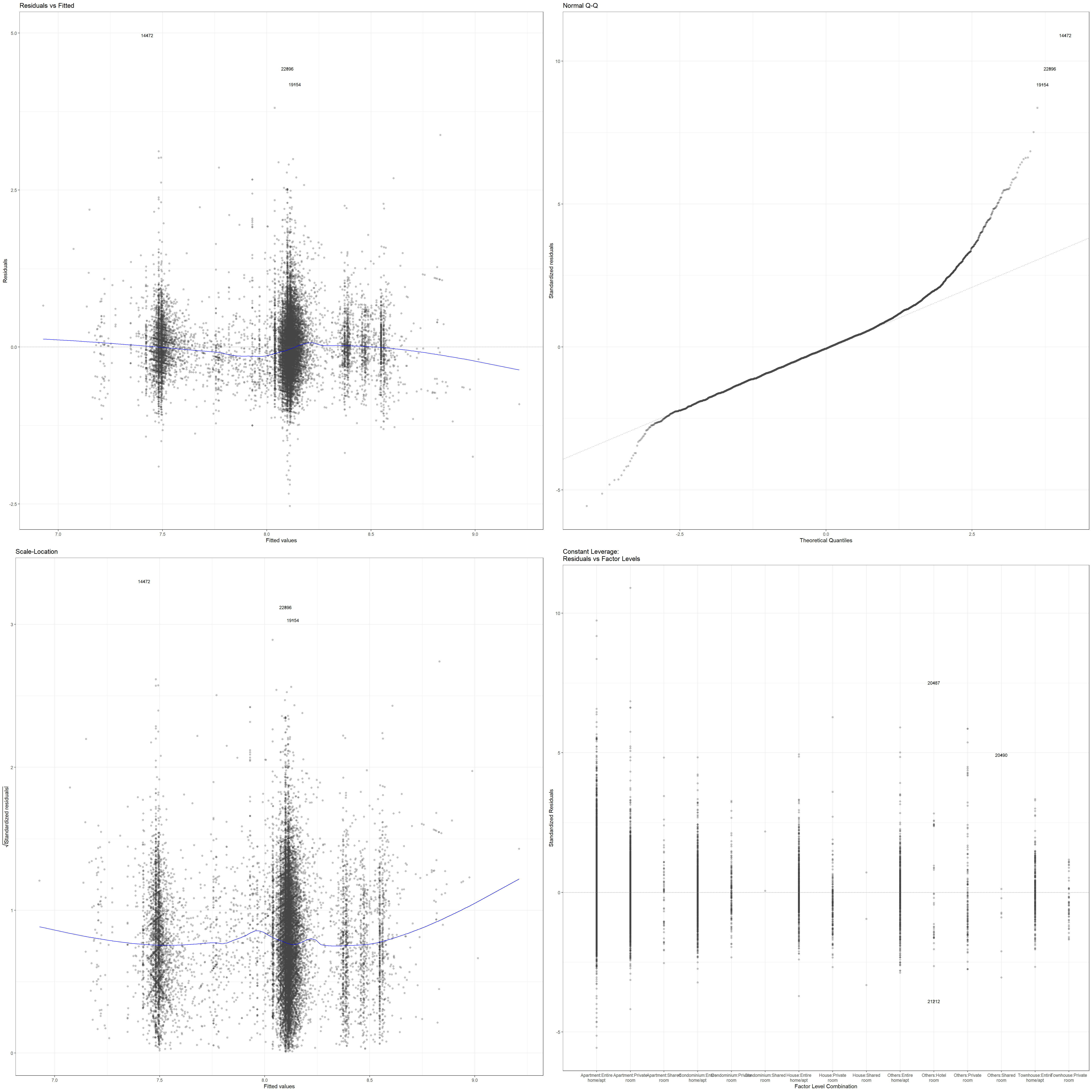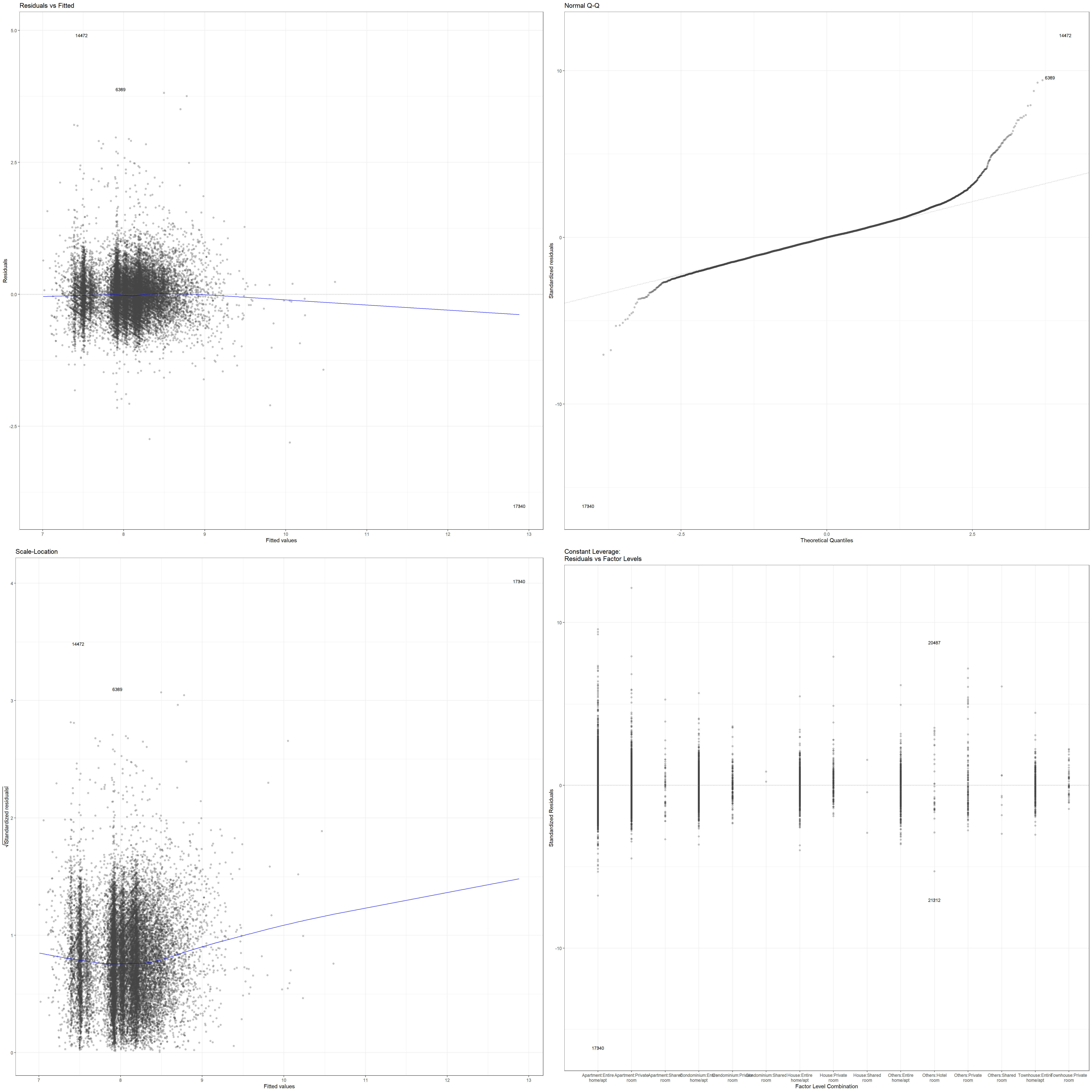As shown in graph above, I observe less pattern in the residuals vs fitted plot compared with previous models, indicating that the addition of variables increased the amount of variation in price_4_nights captured by my model. Similar to previous models, I can conclude that my residuals follow approximately a normal distribution, as the normal Q-Q plot suggests. Again, in terms of scale-location, the equal (or constant) variance assumption also seems to hold, as there is no clear positive nor negative trends across the fitted values. Finally, a number of observations with high absolute residuals indicate that some observations do have undue influence on estimates of model parameters, though this require further investigation which is beyond the remits of the present analysis.