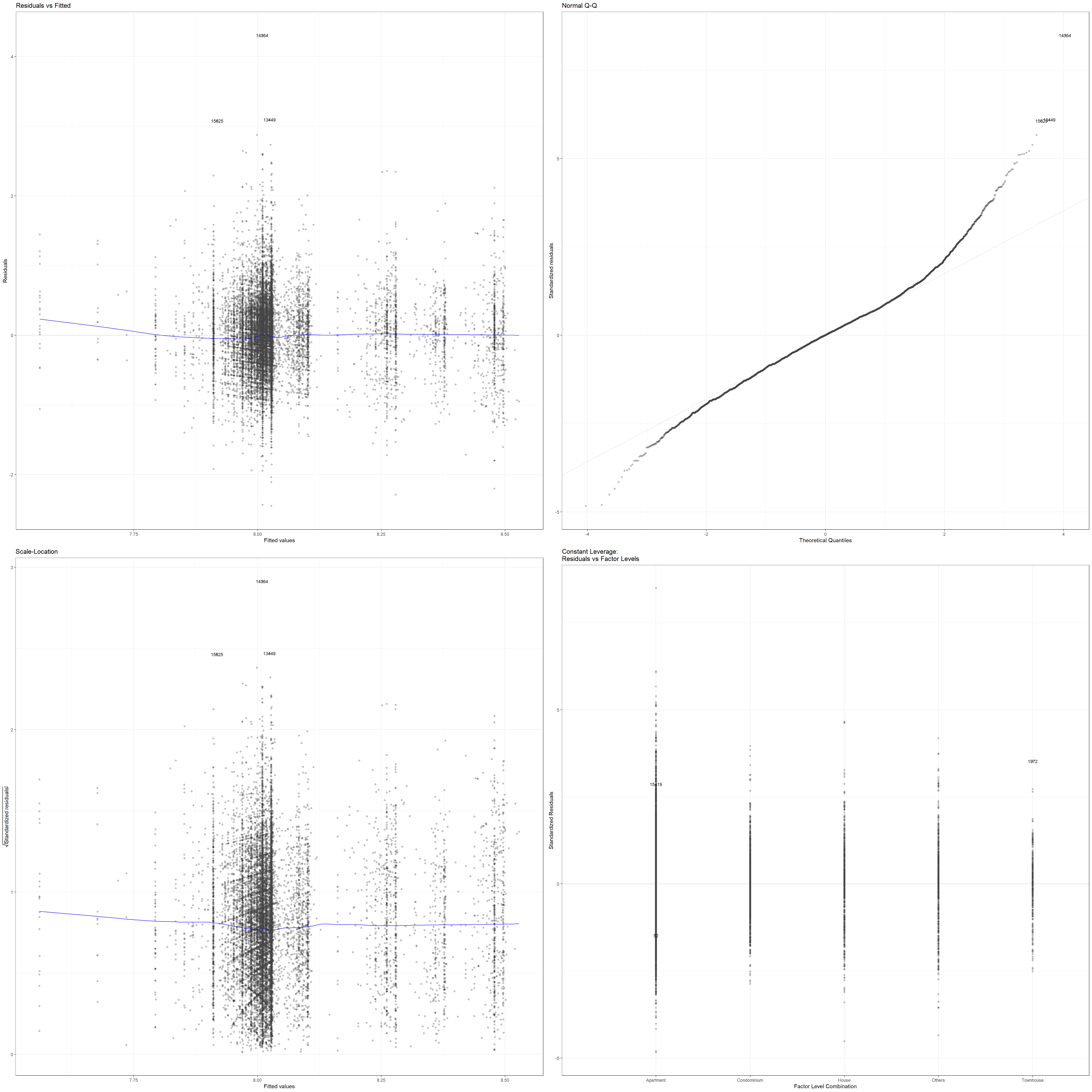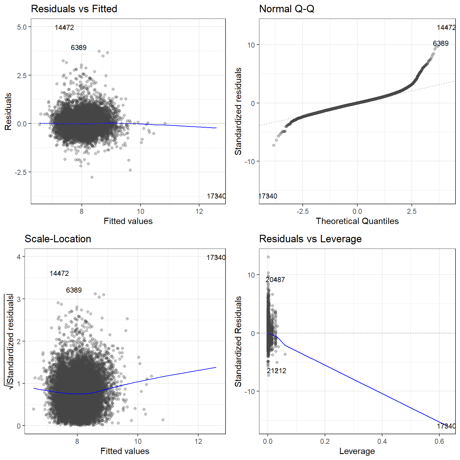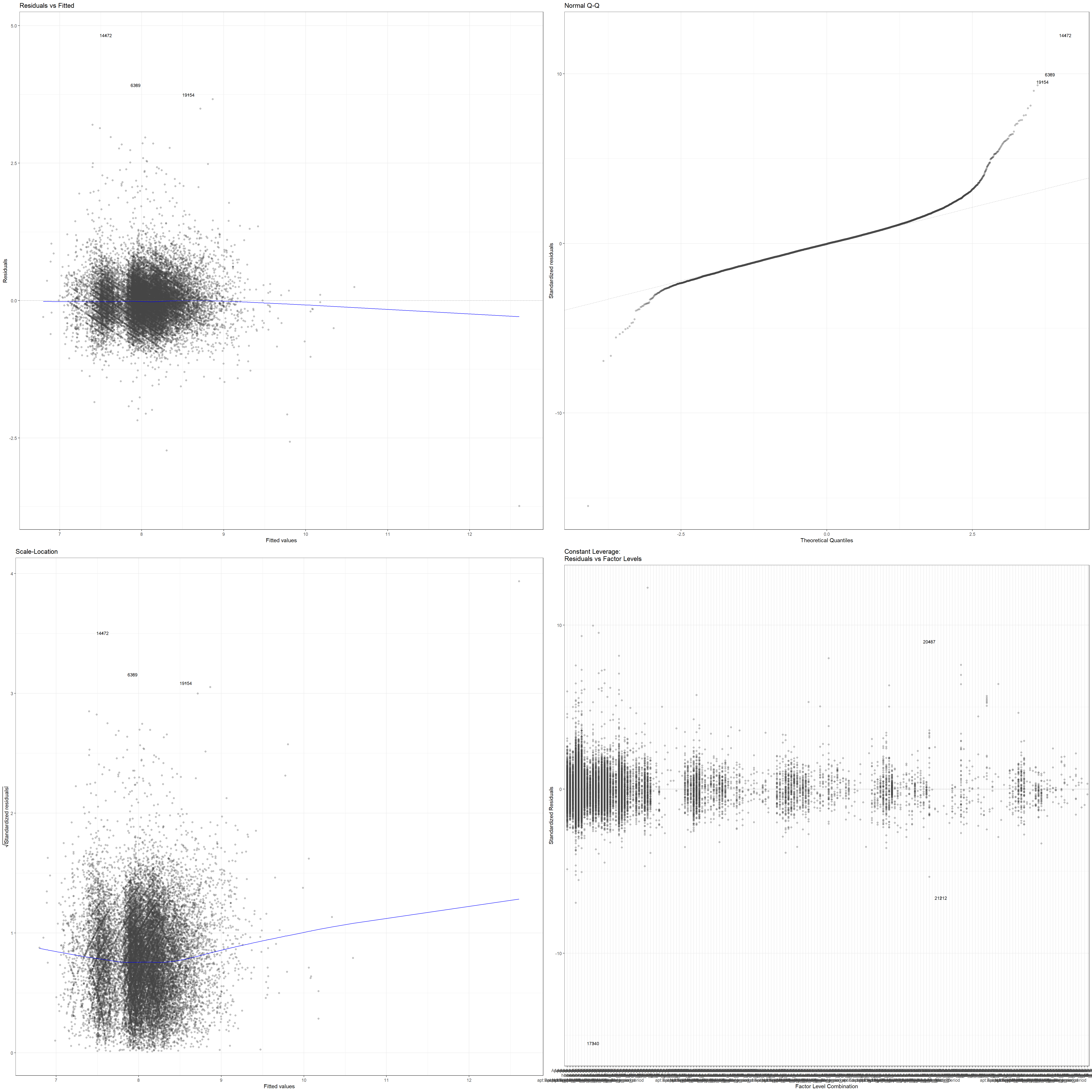 As shown in graph above, I observe less pattern in the residuals vs fitted plot compared with previous models, indicating that the addition of variables increased the amount of variation in price_4_nights captured by my model. Similar to previous models, I can conclude that my residuals follow approximately a normal distribution, as the normal Q-Q plot suggests. Again, in terms of scale-location, the equal (or constant) variance assumption also seems to hold, as there is no clear positive nor negative trends across the fitted values. Finally, a number of observations with high absolute residuals indicate that some observations do have undue influence on estimates of model parameters, though this require further investigation which is beyond the remits of the present analysis.