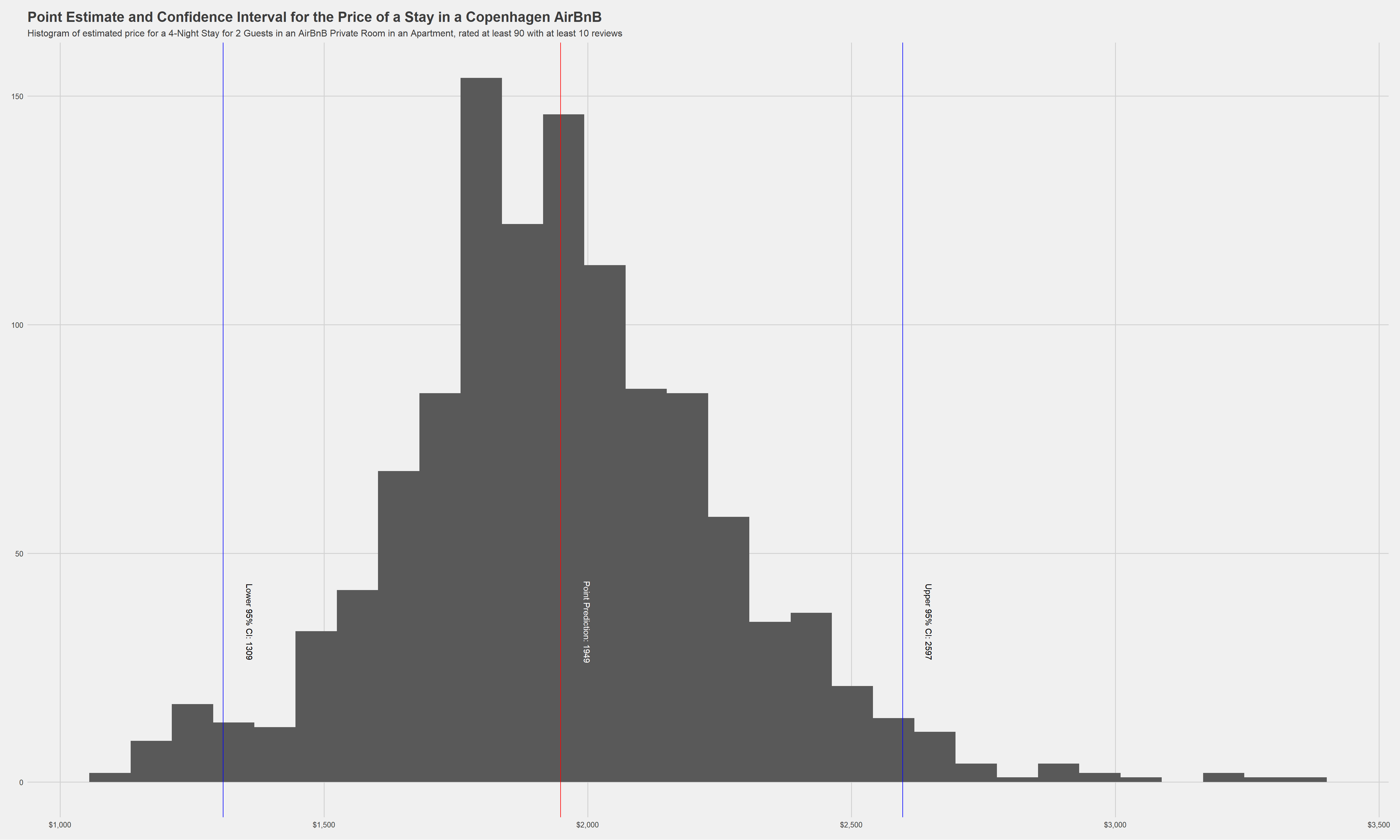 - The point estimate generated by the optimal model for the price of a 4-night stay in Copenhagen for 2 people was $1949 with a confidence interval of $1309 to $2597